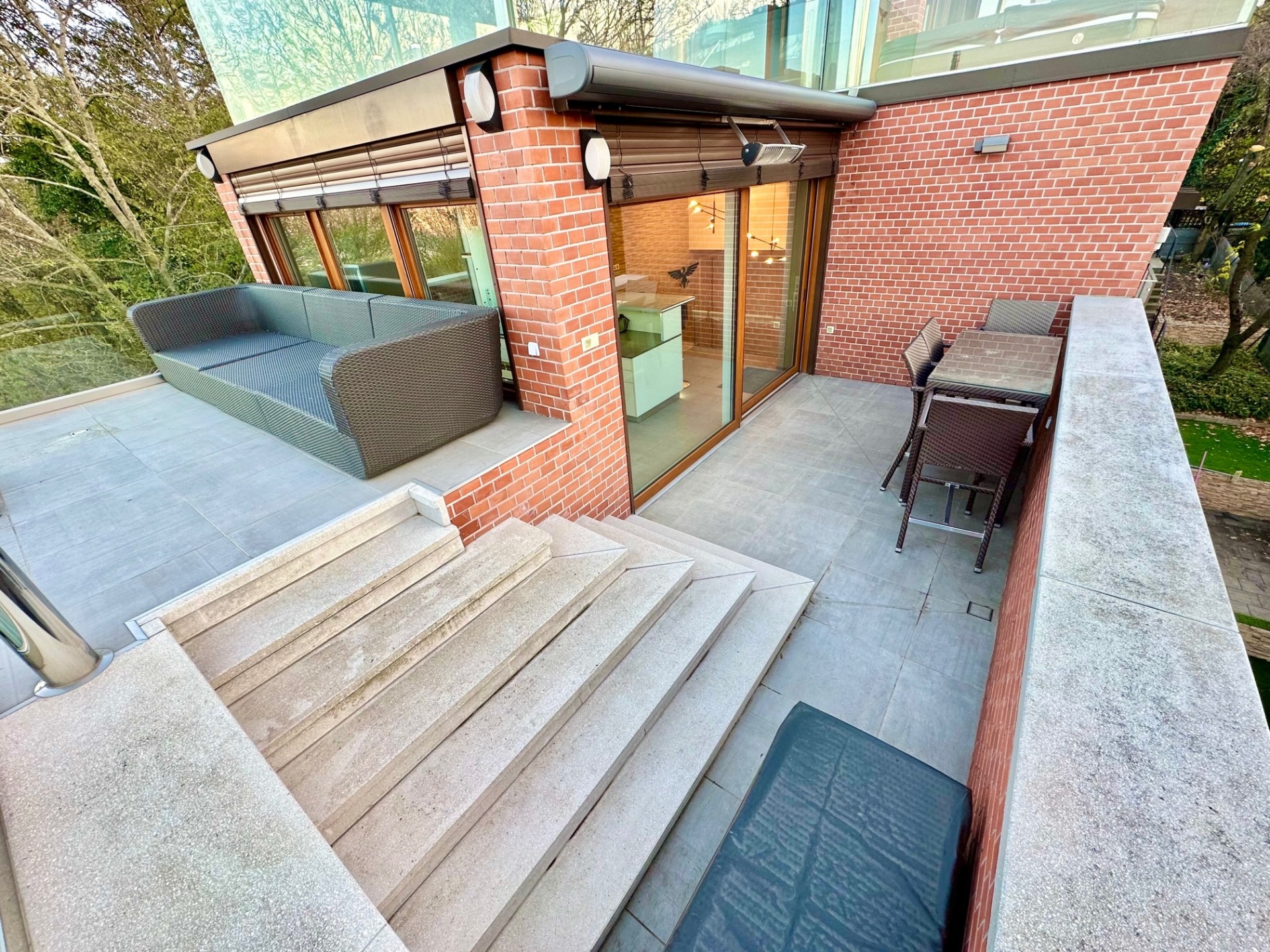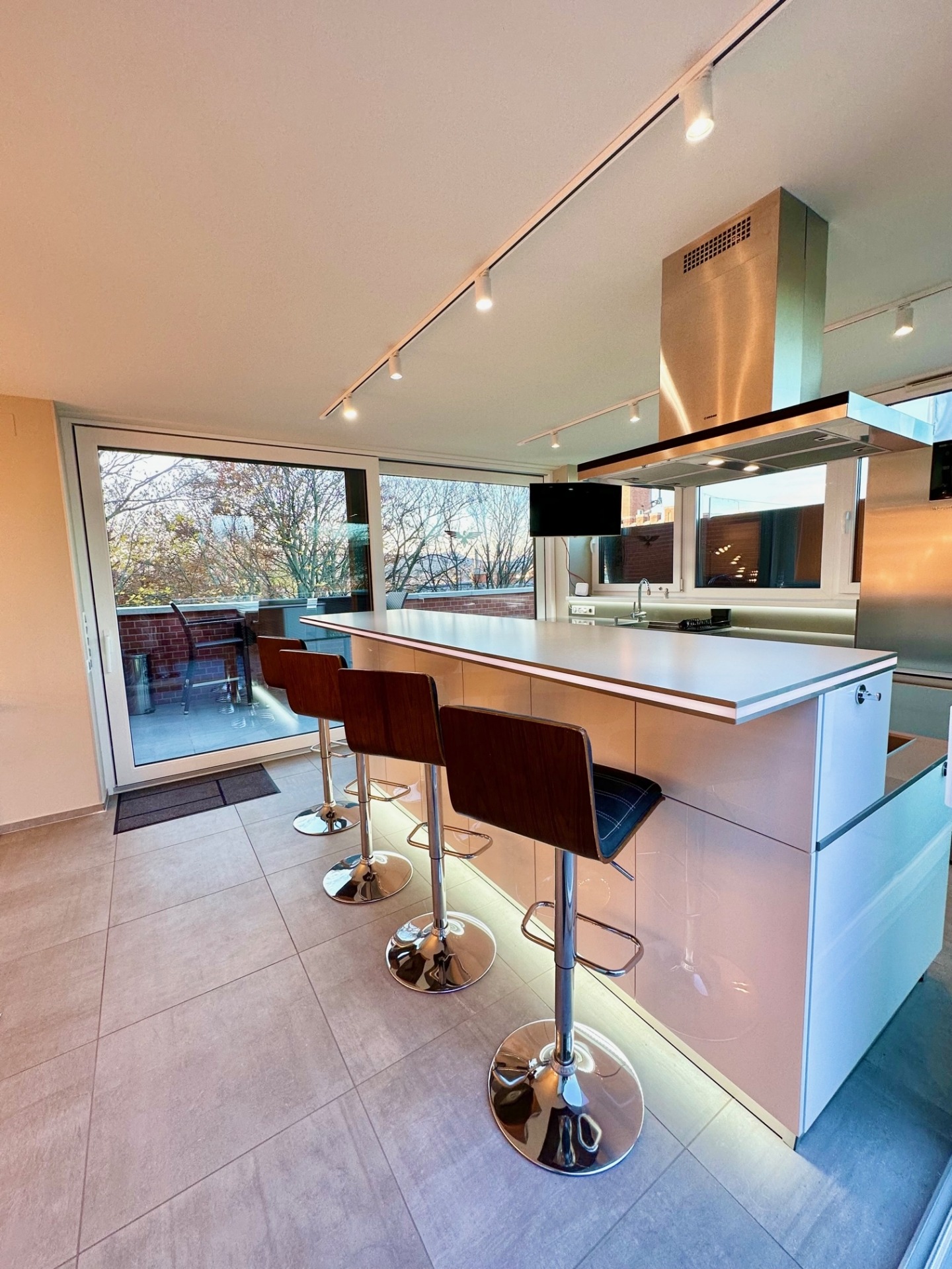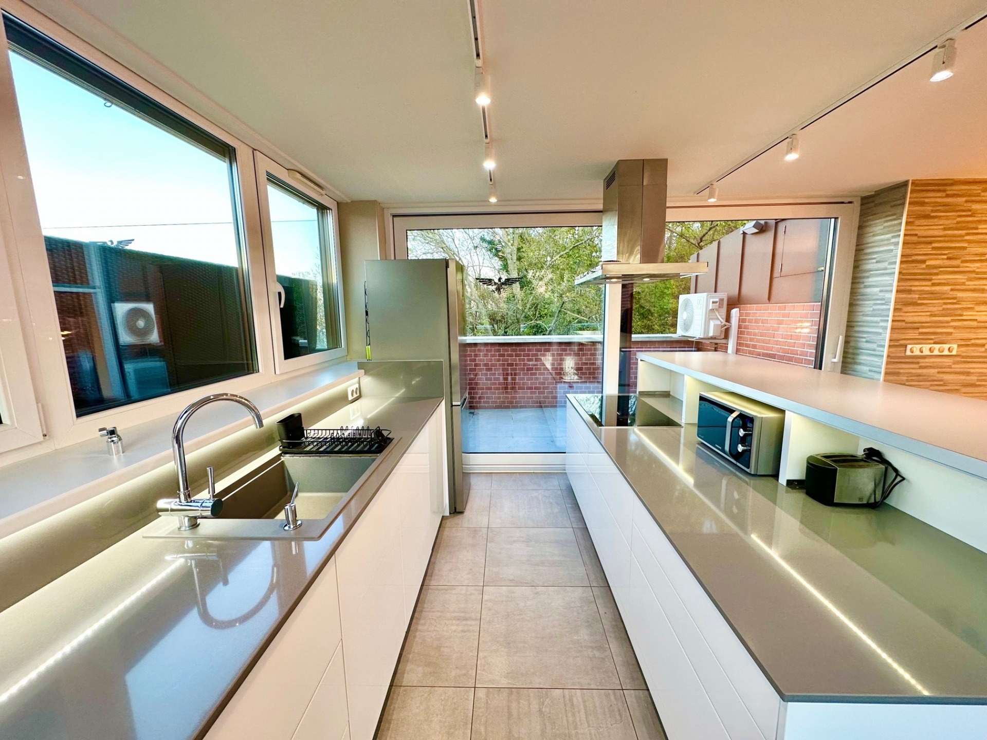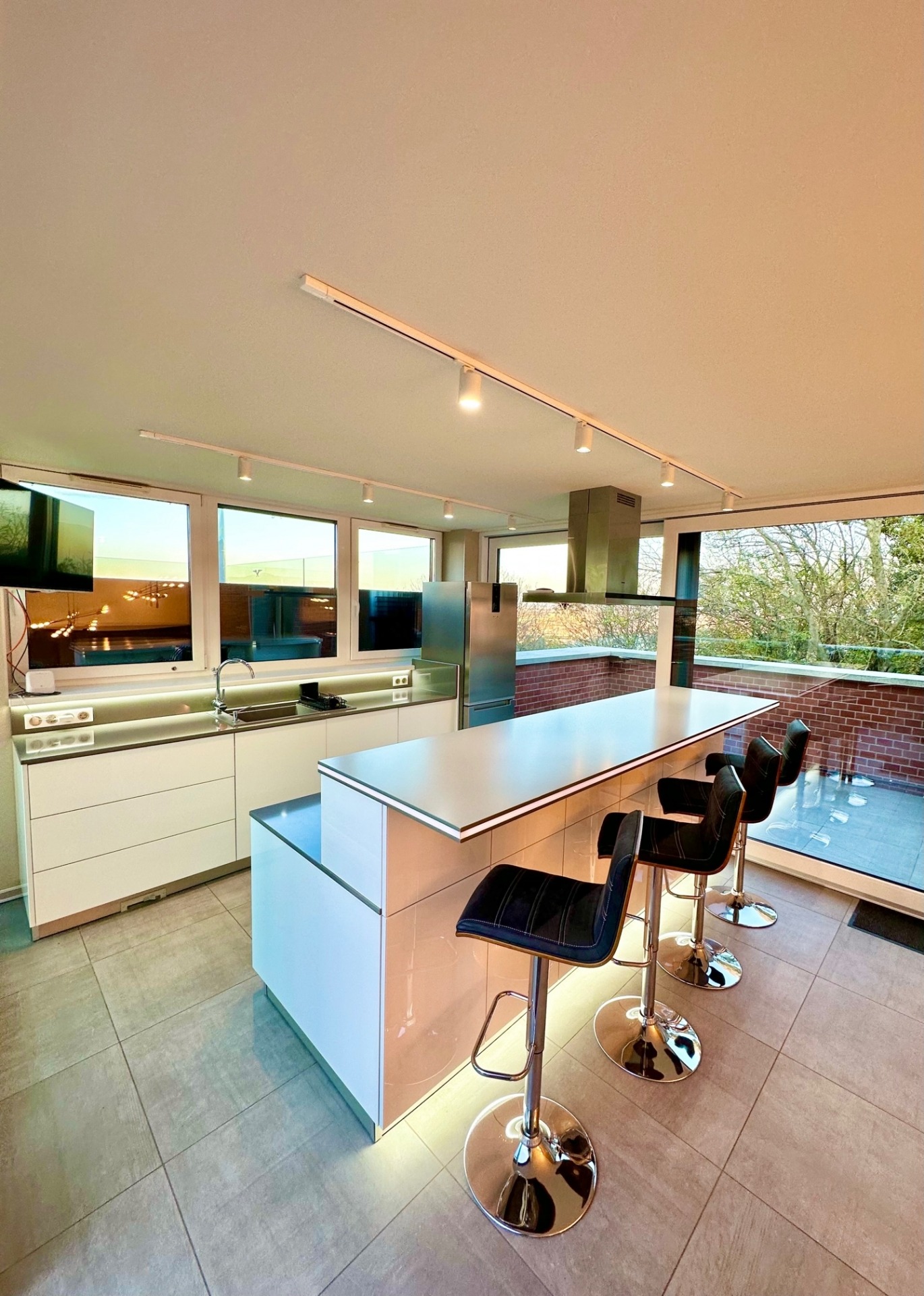 Tetőszinten: panorámás konyha bárpulttal, 3 terasz társasági eseményekhez