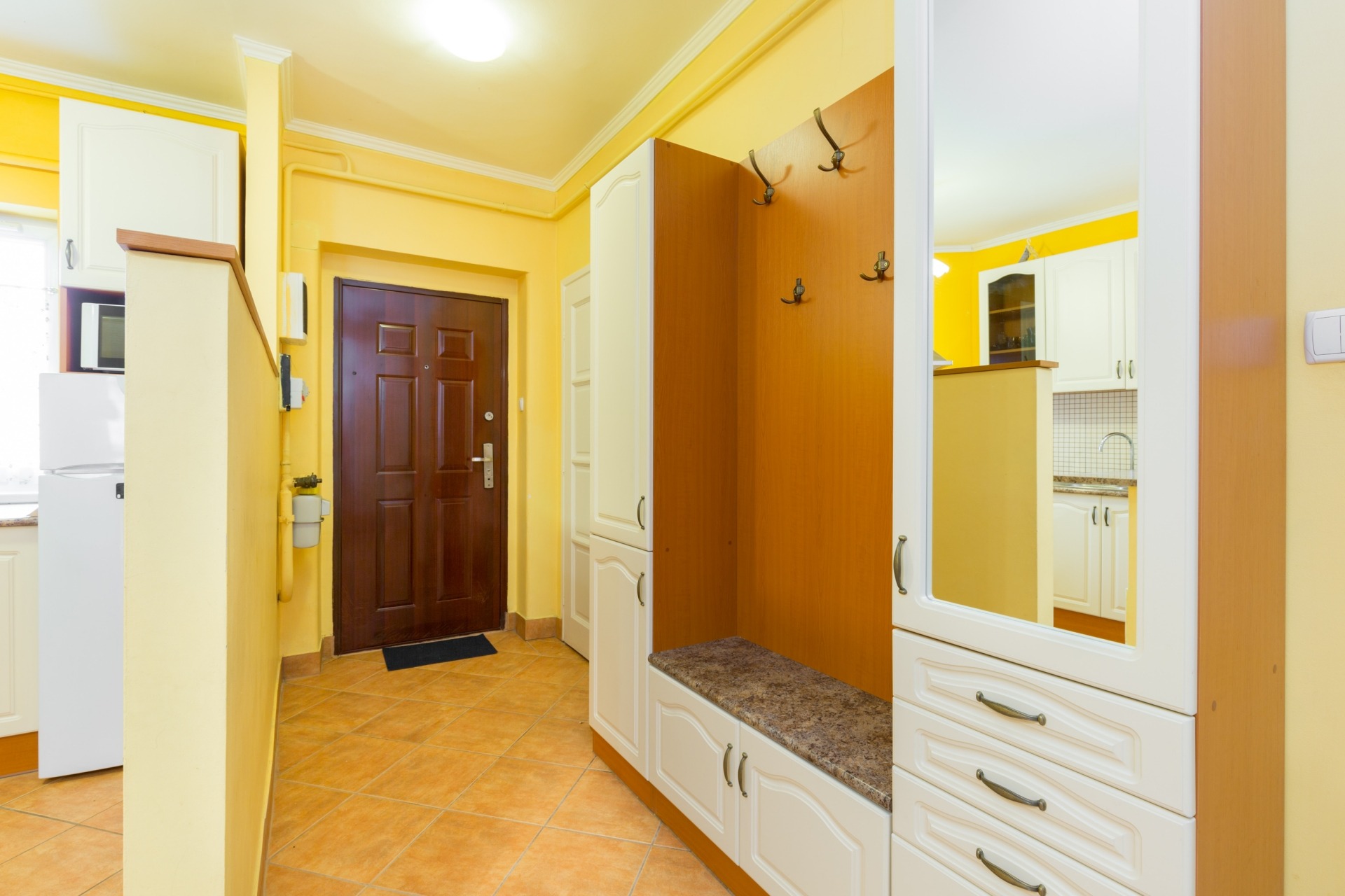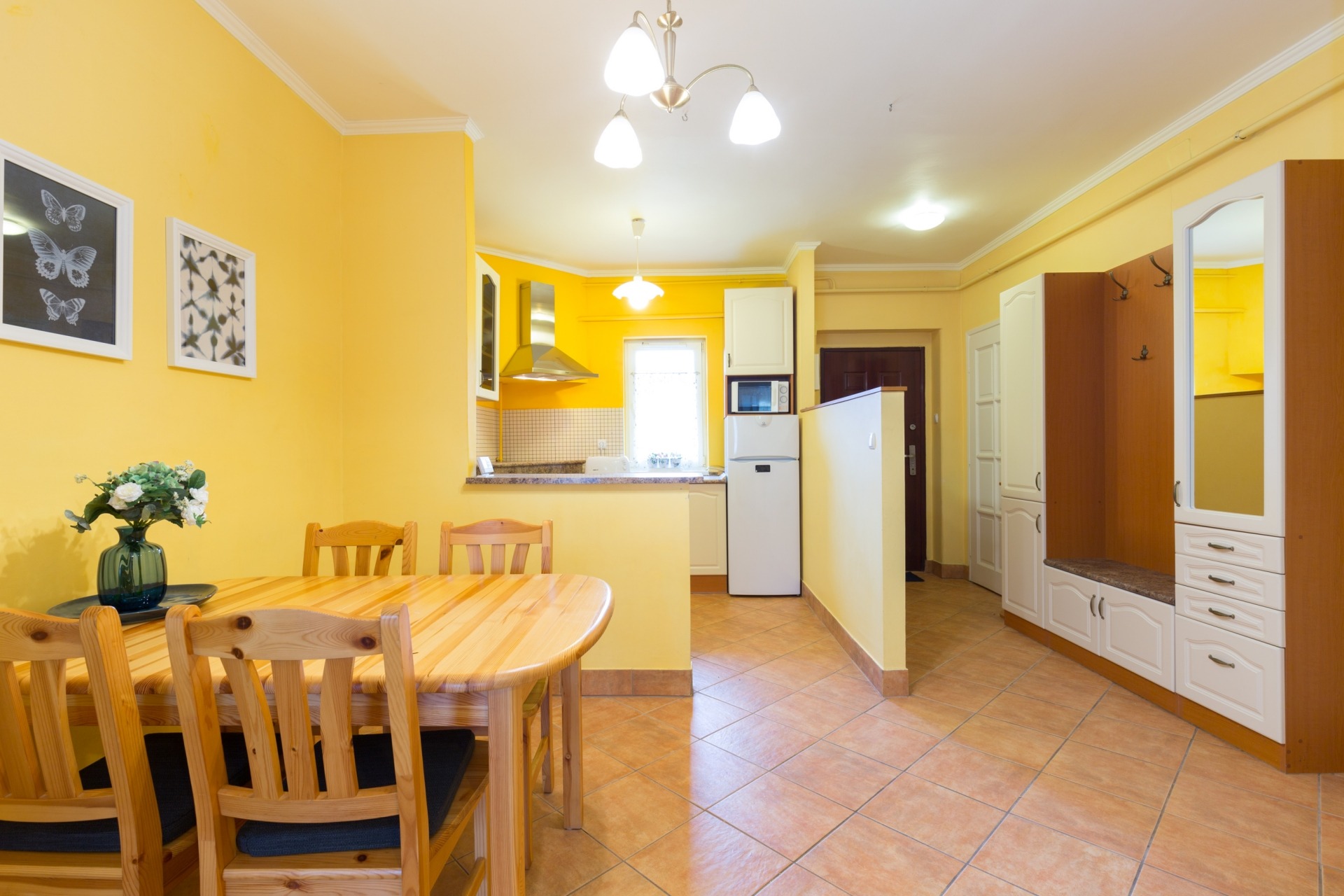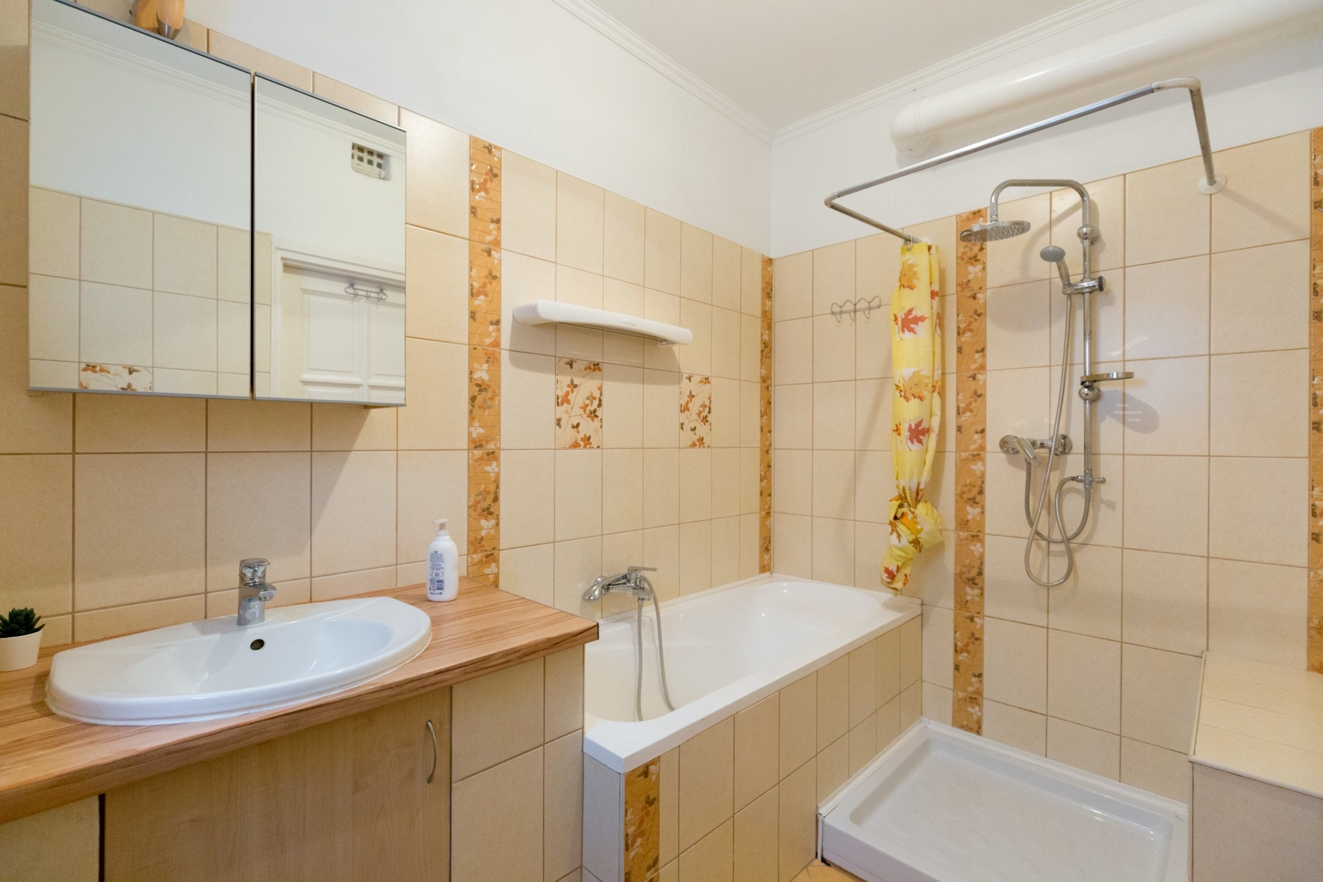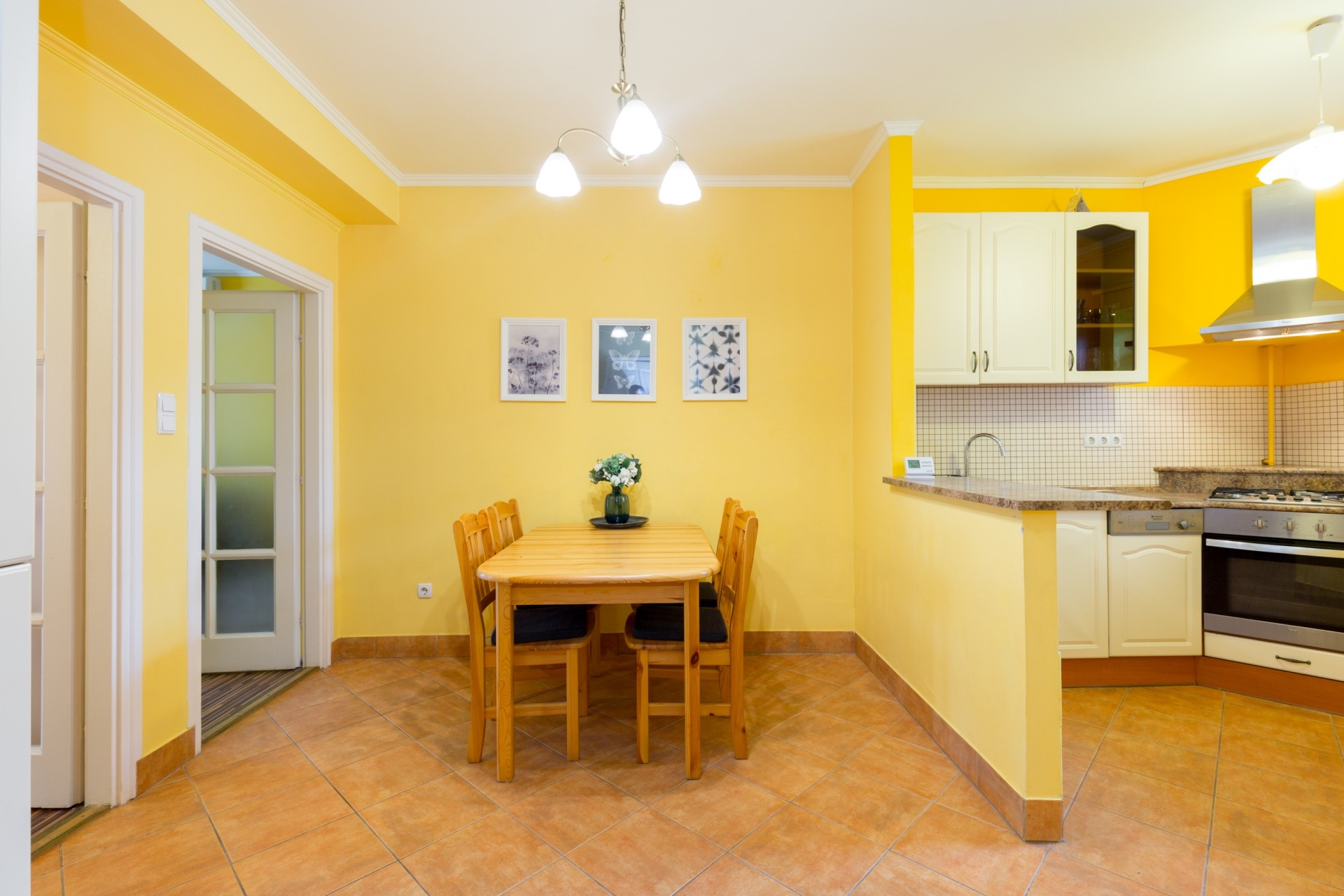 A világos, csendes lakás ablakai belső udvarra néznek, frissen festett falai fehér és bézs színűek, amelyek elegáns, semleges hátteret adnak a berendezésnek. A tágas konyha-étkező szeparált, a szobák külön ajtóval leválaszthatók. A kellemes hőérzetről légkondicionáló gondoskodik.