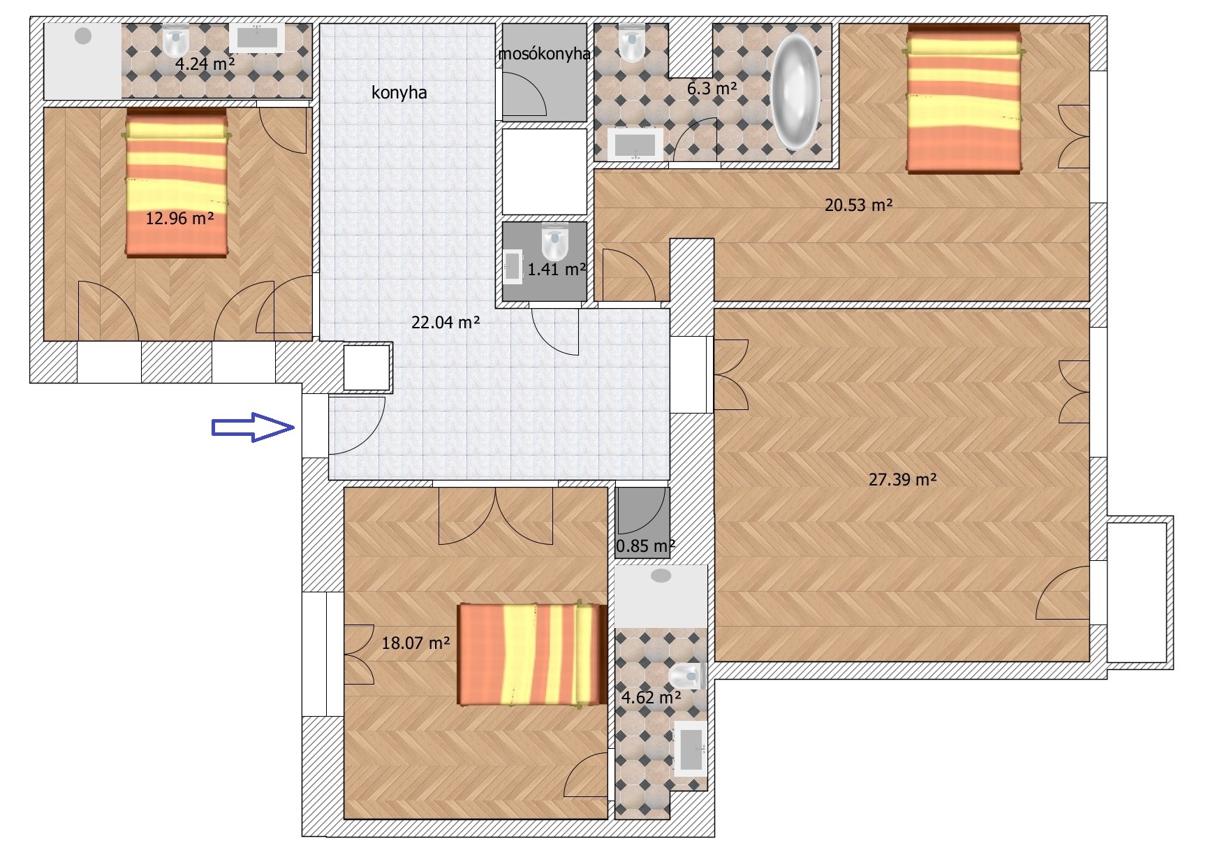 A lakás nappali + 3 hálószoba, 3 fürdőszoba, vendég-wc, kamra, mosókonyha és erkély elosztású, kelet–nyugati fekvésének köszönhetően rendkívül világos.