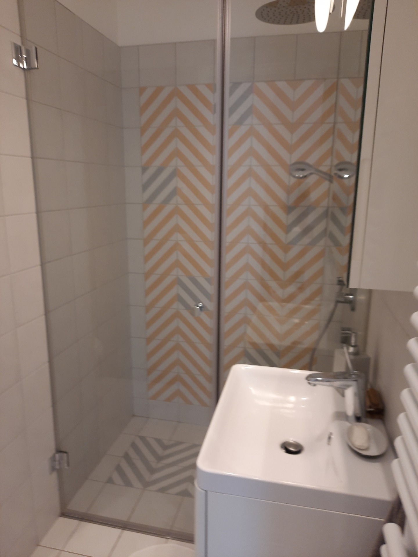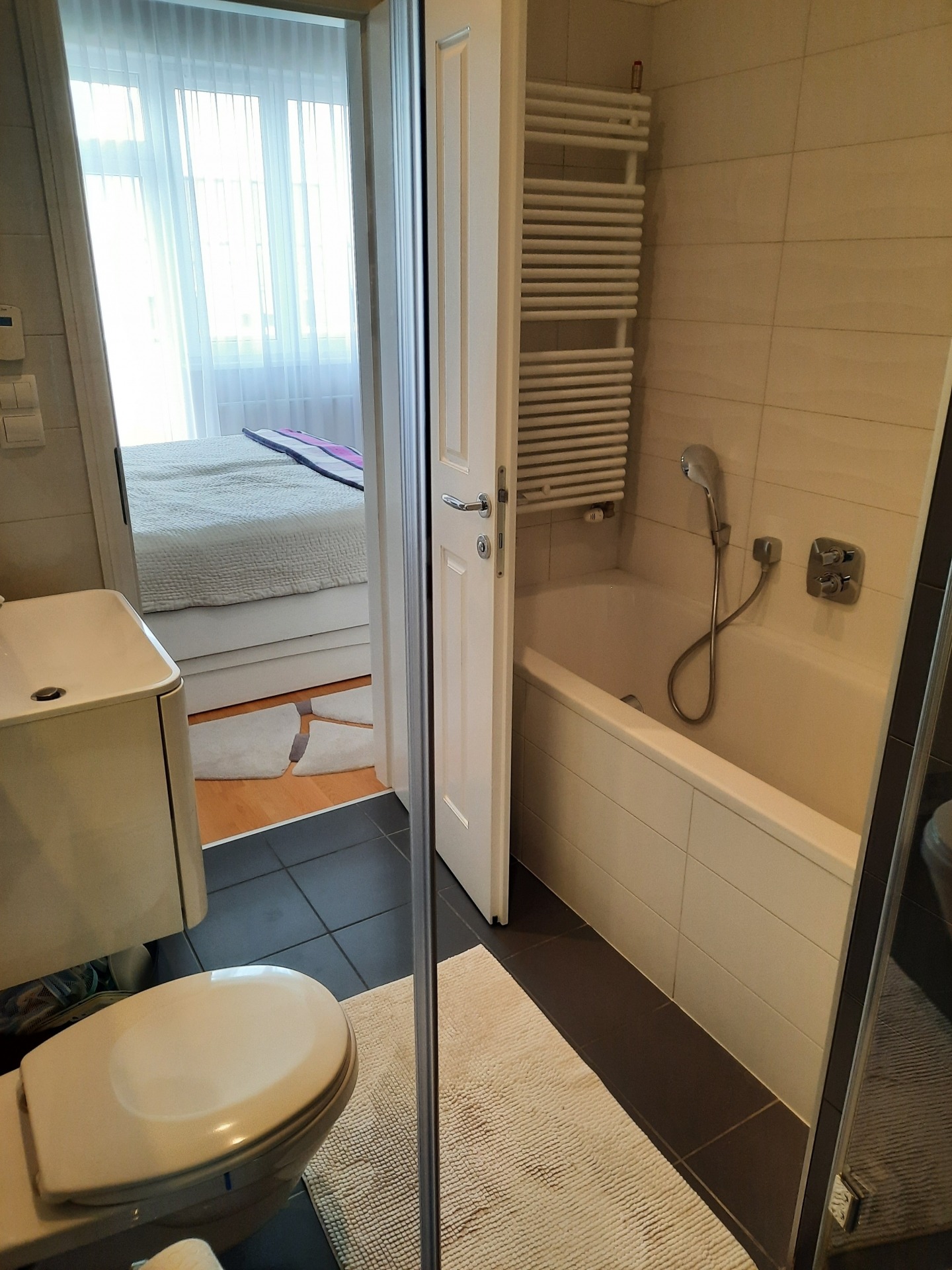 Underfloor heating in tiled areas, panel radiators in rooms